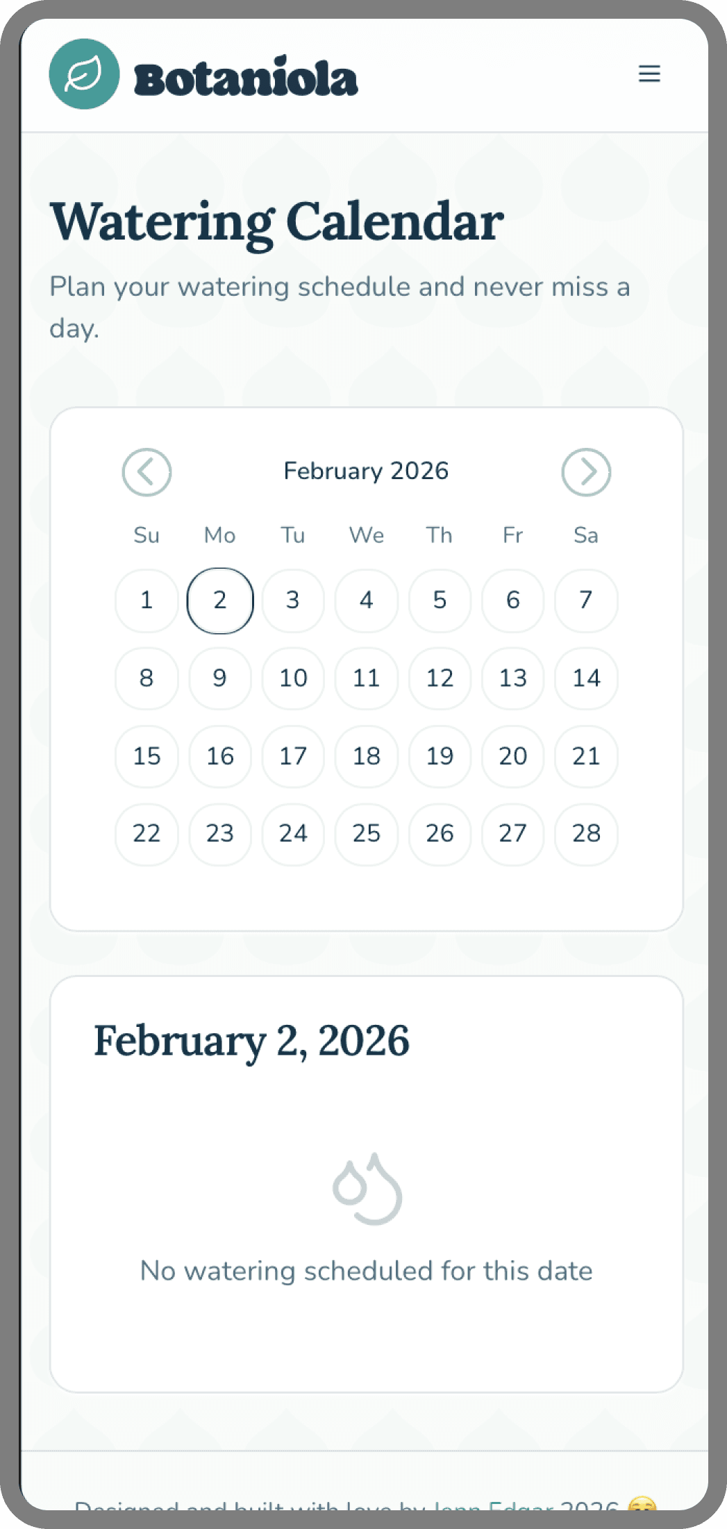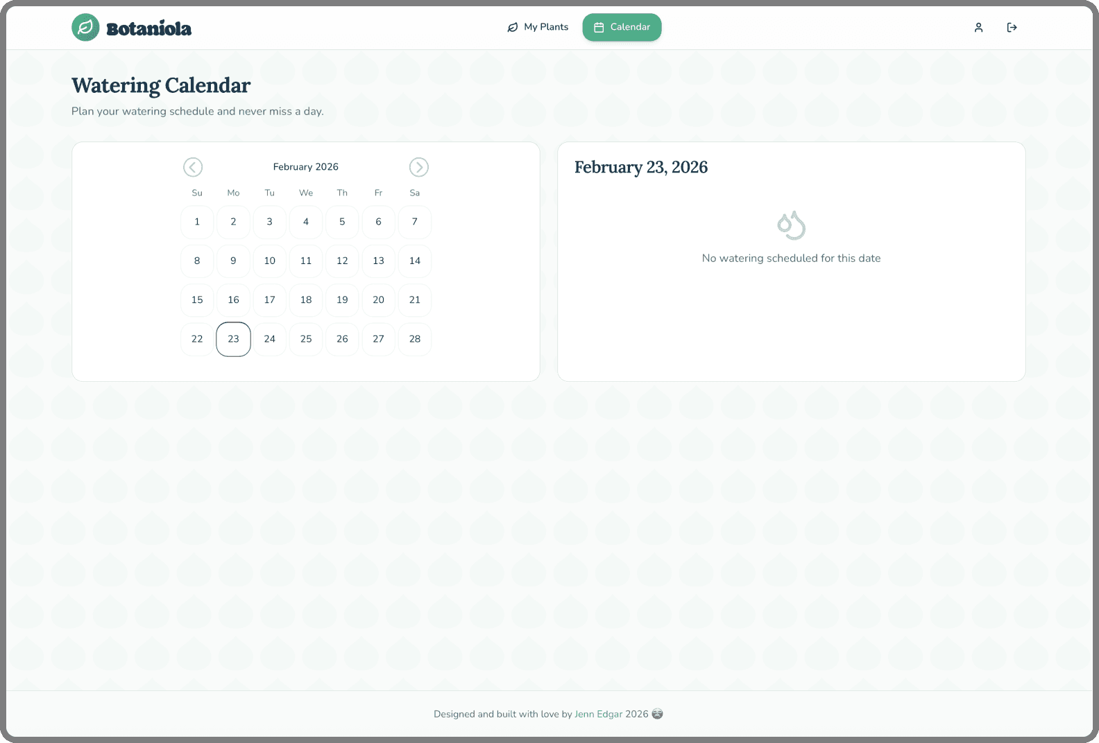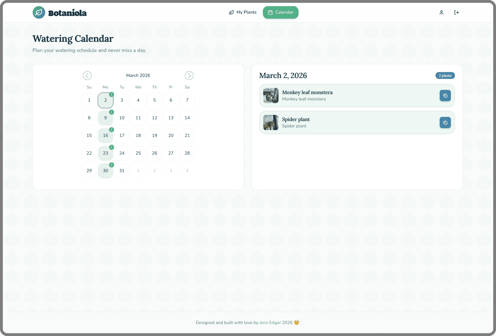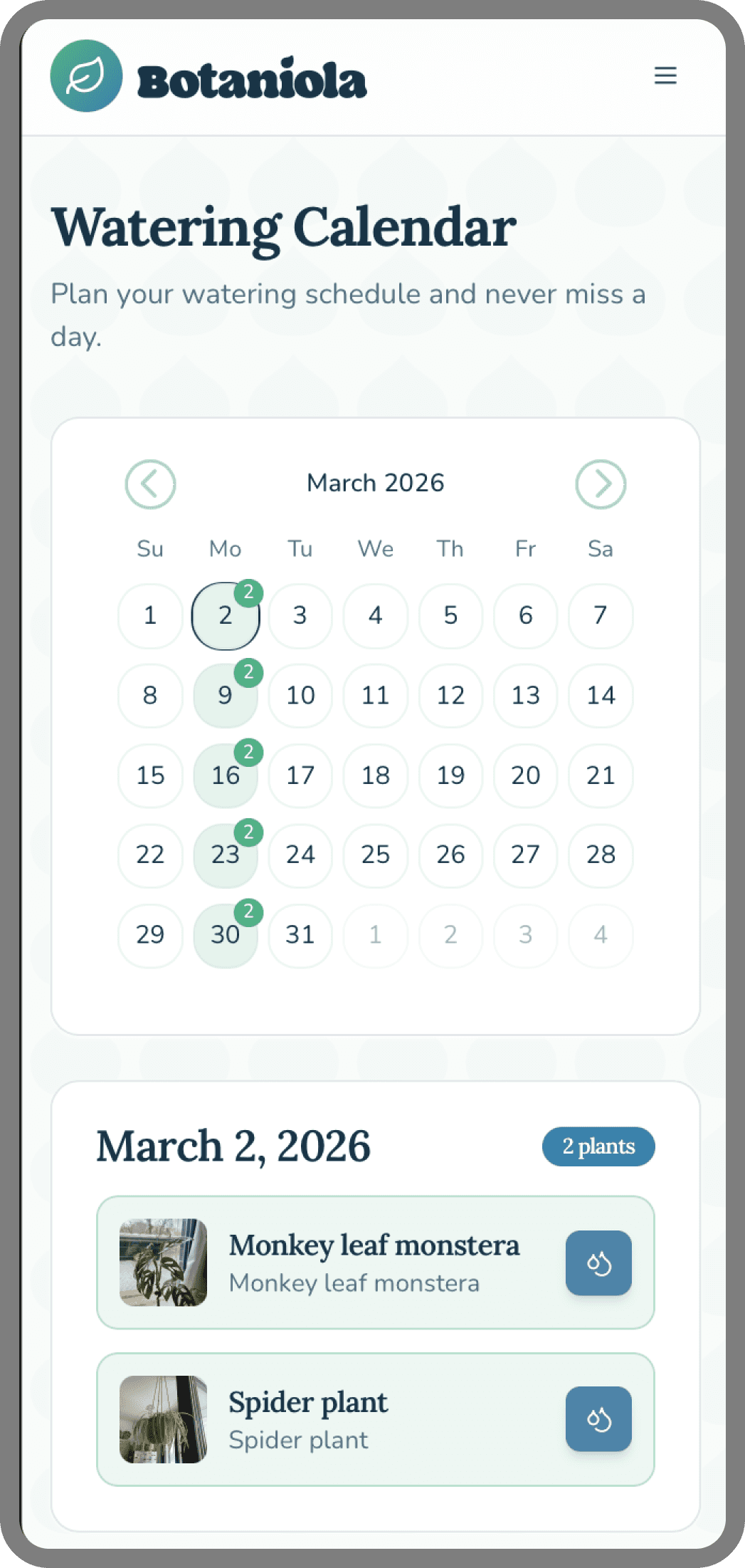 Monthly view with watering indicators