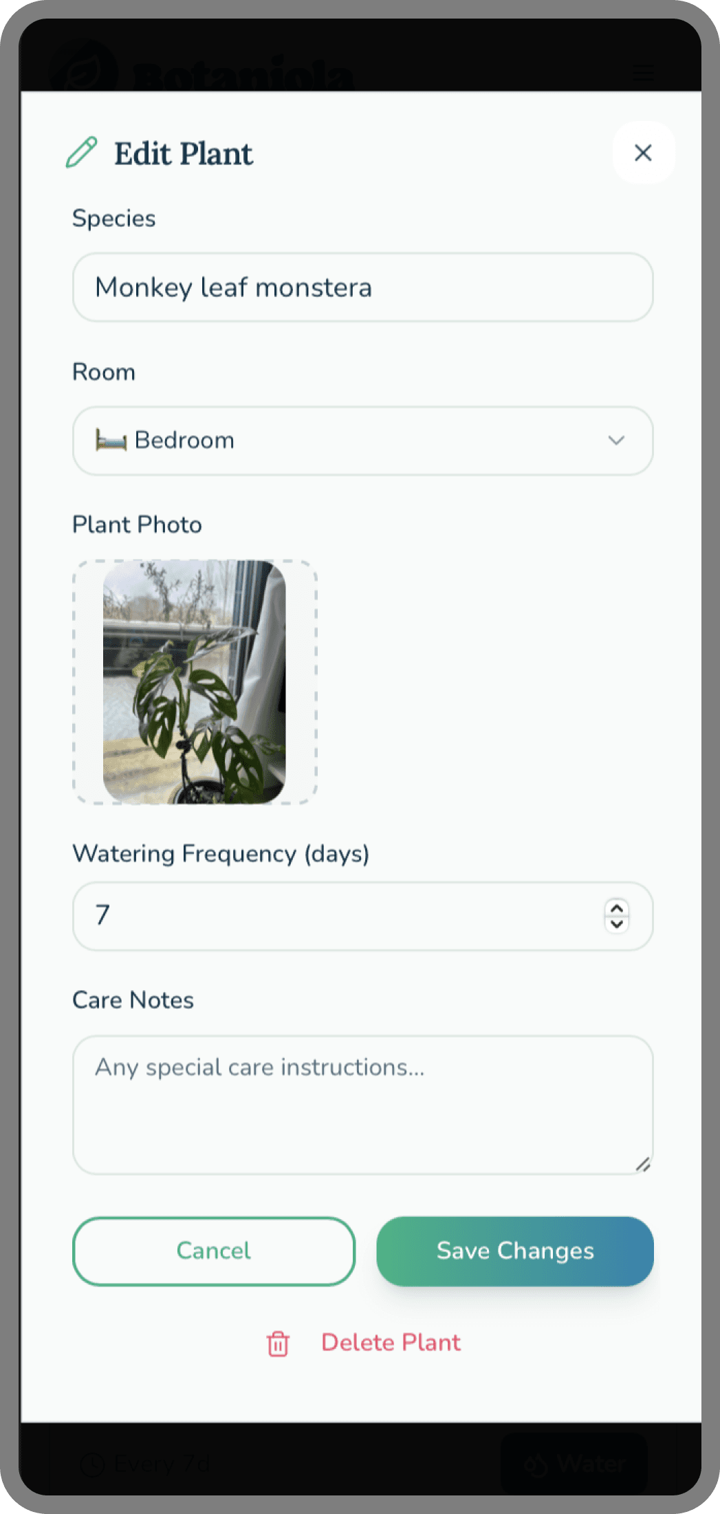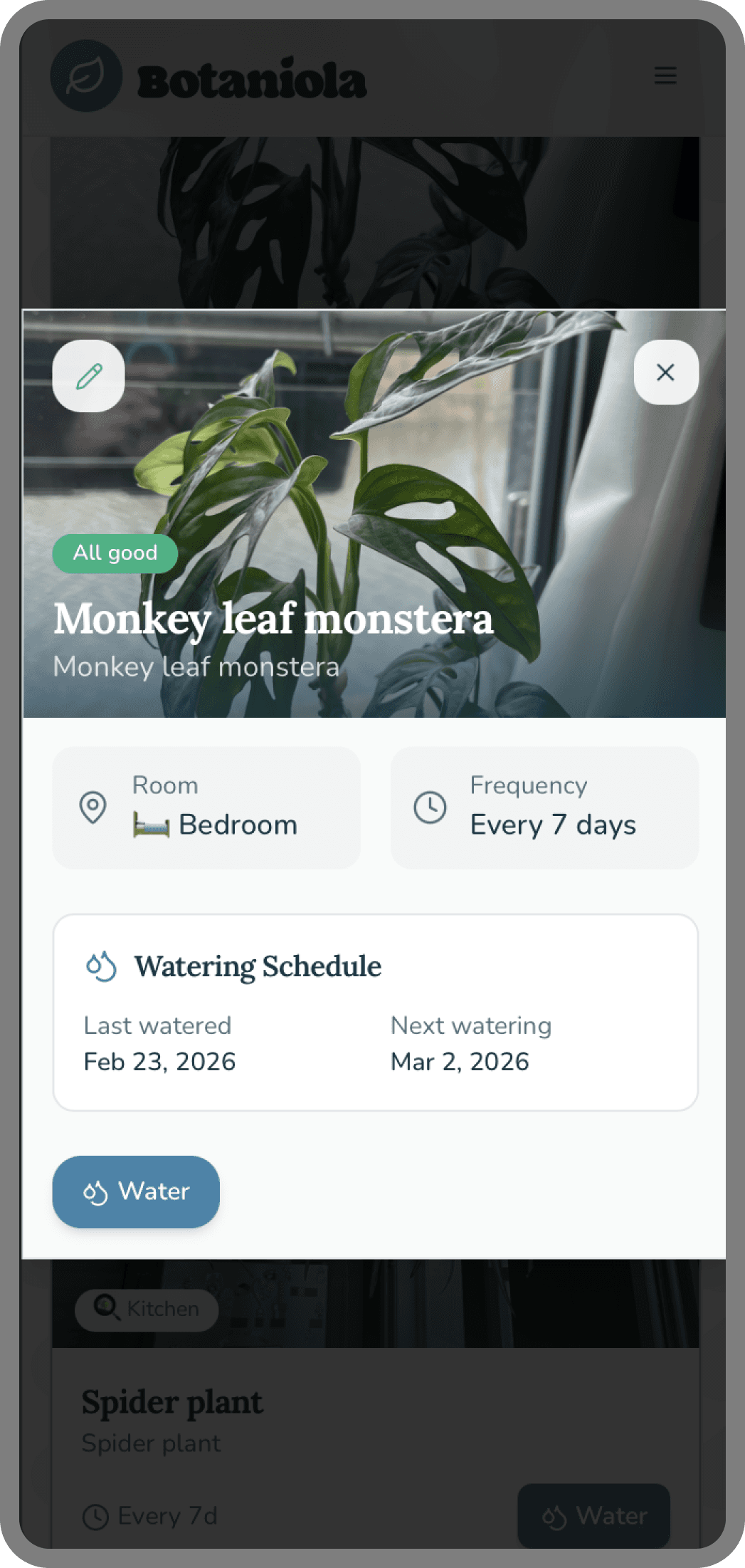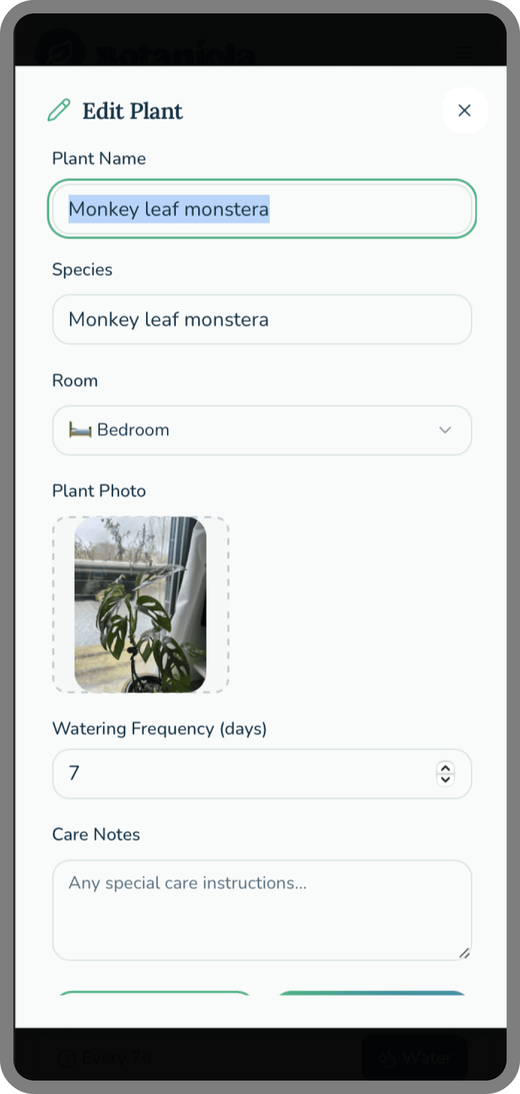 Plants die, get repotted and renamed. Plants get gifted. The edit flow is one tap away, no hidden menus. Respect the user's reality.
