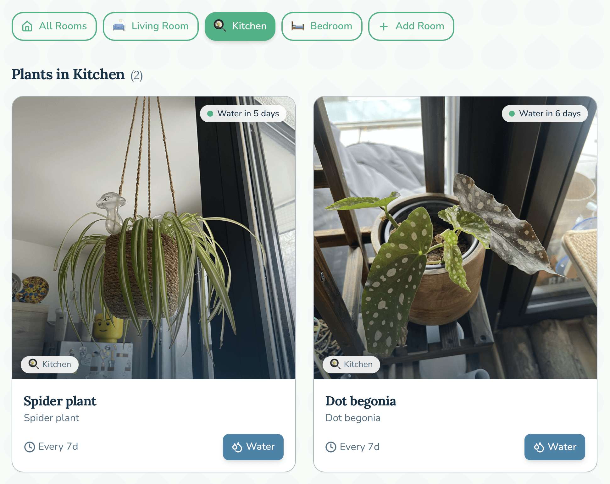 Grouping by room turned out to be the killer feature in testing. Plant parents often water in batches, everything in the bedroom at once. This simple sort matches real world behavior.