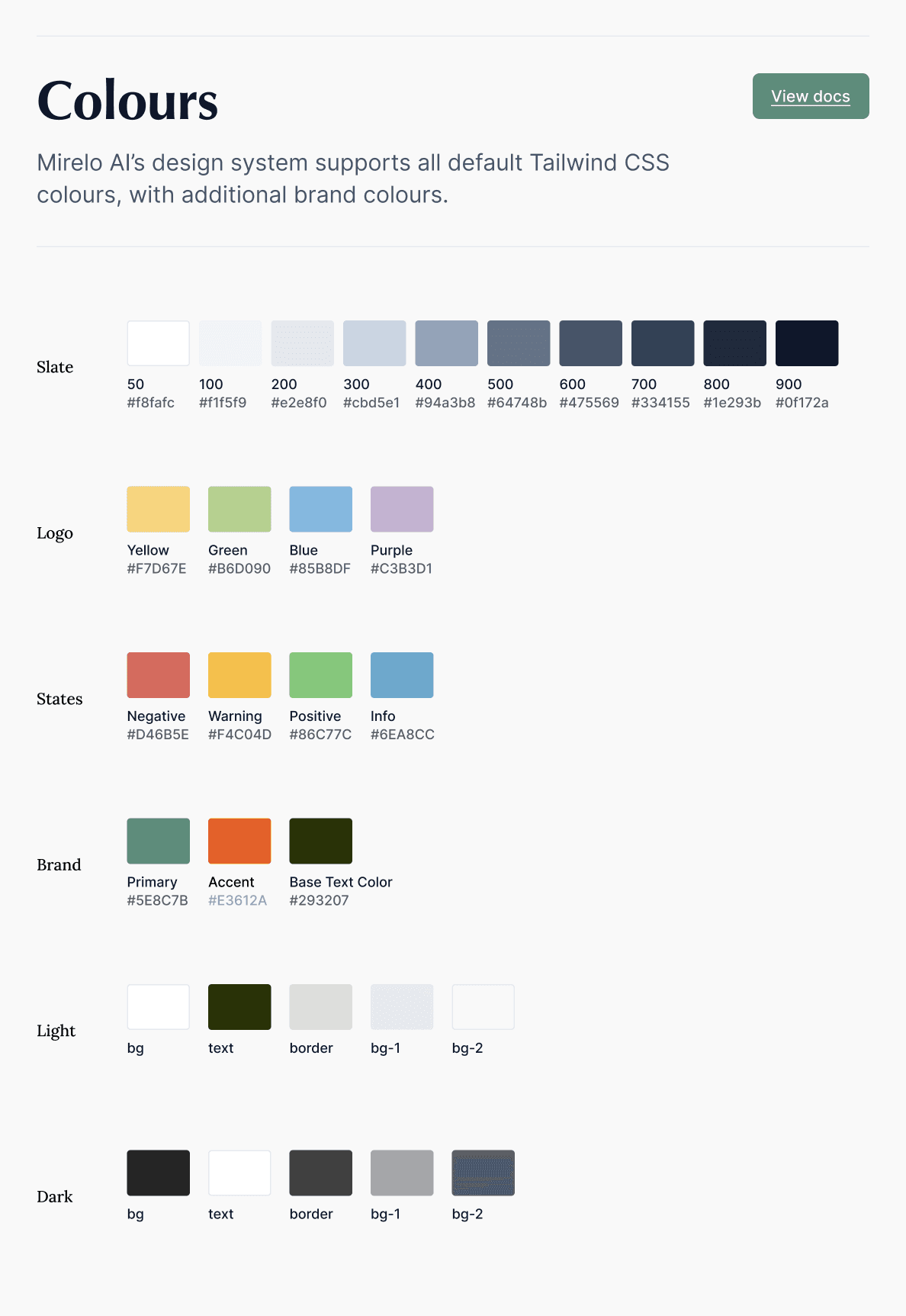When I joined Mirelo.AI, the company was experiencing the classic growing pains of a funded, fast-moving startup. While the engineering team had adopted Tailwind CSS for development efficiency, there was no centralized design source of truth. Design files were scattered, UI components were inconsistently implemented across the web app and marketing site, and every new feature required designers and engineers to rediscover or reinvent basic elements like buttons and typography. This inconsistency created a slow, error-prone workflow and risked diluting the product’s evolving brand identity.