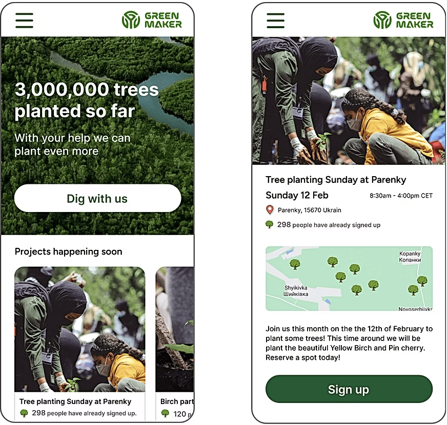 Greenmaker is a startup that is dedicated to promoting sustainable living and reforestation efforts in Eastern Europe, with a particular emphasis on rehabilitating damaged areas in post-war Ukraine. Despite having an existing tree inventory map, the team realised that the prototype lacked clarity on its target audience, and how it could effectively address the specific needs related to the reforestation efforts.